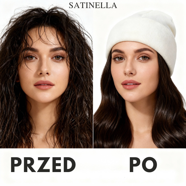 Satynowa podszewka naprawdę działa — włosy po zdjęciu czapki są gładkie, lśniące i bez puszenia.